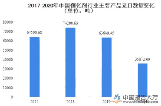 2017年以来,我国催化剂行业主要产品进口数量和金额均呈现先升后降走势,2018年,我国催化剂主要产品进口量为74200.63吨,创近年新高。2020-2026年中国石油化工用催化剂行业市场深度研究及发展前景投资可行性分析报告指出,截至到2020年6月底,全国催化剂主要产品进口量为35872.09吨。