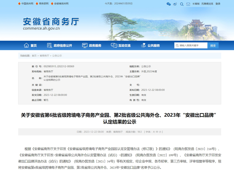 近日,安徽省商务厅公布2023年“安徽出口品牌”认定名单, 此次评选全省共44家企业,54个品牌获得认定,球速体育科技“